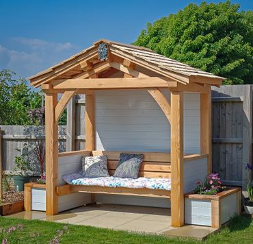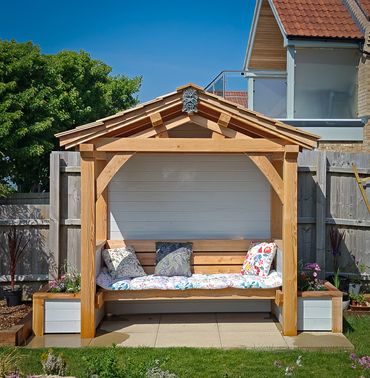 The arbour comes empty as standard so that you can use your own furniture but we can build a matching bench and planters too.
