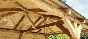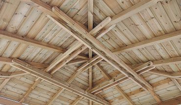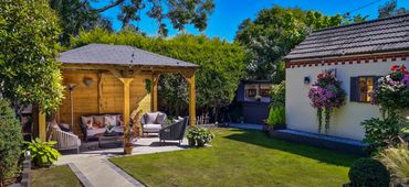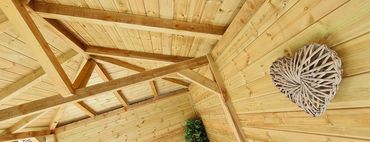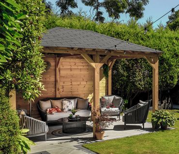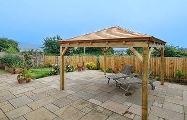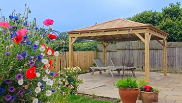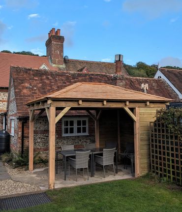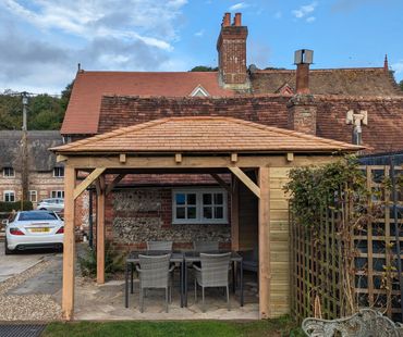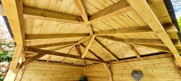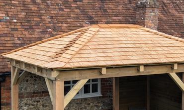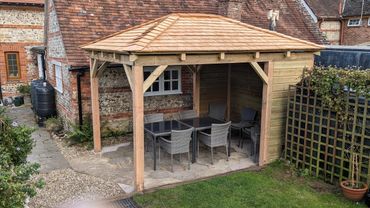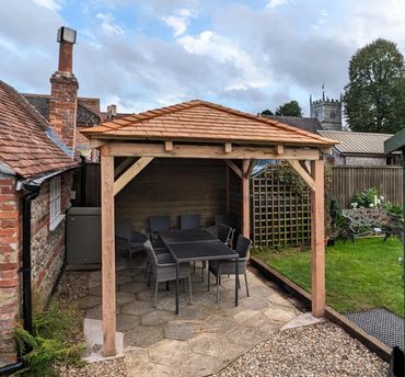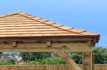 Our beautiful hip and ridge gazebos create a tranquil, sheltered space for you to enjoy, whatever the weather. We have two versions - a solid redwood with 6" posts and thick felt tiles or cedar shingles; or the luxury English Oak with 6" posts, oak tongue and groove ceiling and cedar shingles. Bespoke sizes are available.