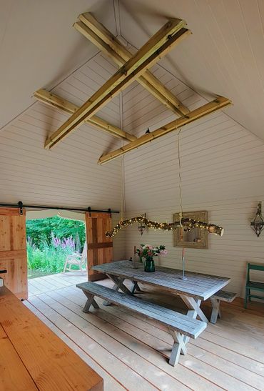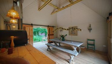 A magical summerhouse, perfect for siorées and get-aways. The building is wrapped in cedar shingles and has a Douglas fir deck floor and larch sliding doors on iron rails.