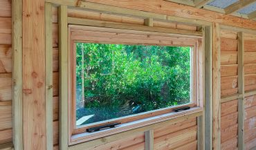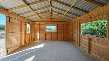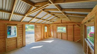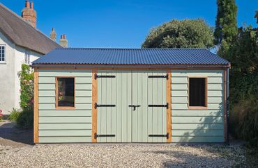 Our workshop is built with a heavy Dorset-grown main frame and cladding and finished with solid black iron fittings and an anti-drip corrugated roof. The natural larch will turn silver-grey over time and blend into the garden very well. The cladding can be left natural or painted and the roof and gutters come in a range of colours. We can add shelving and workbenches as per your requirements.